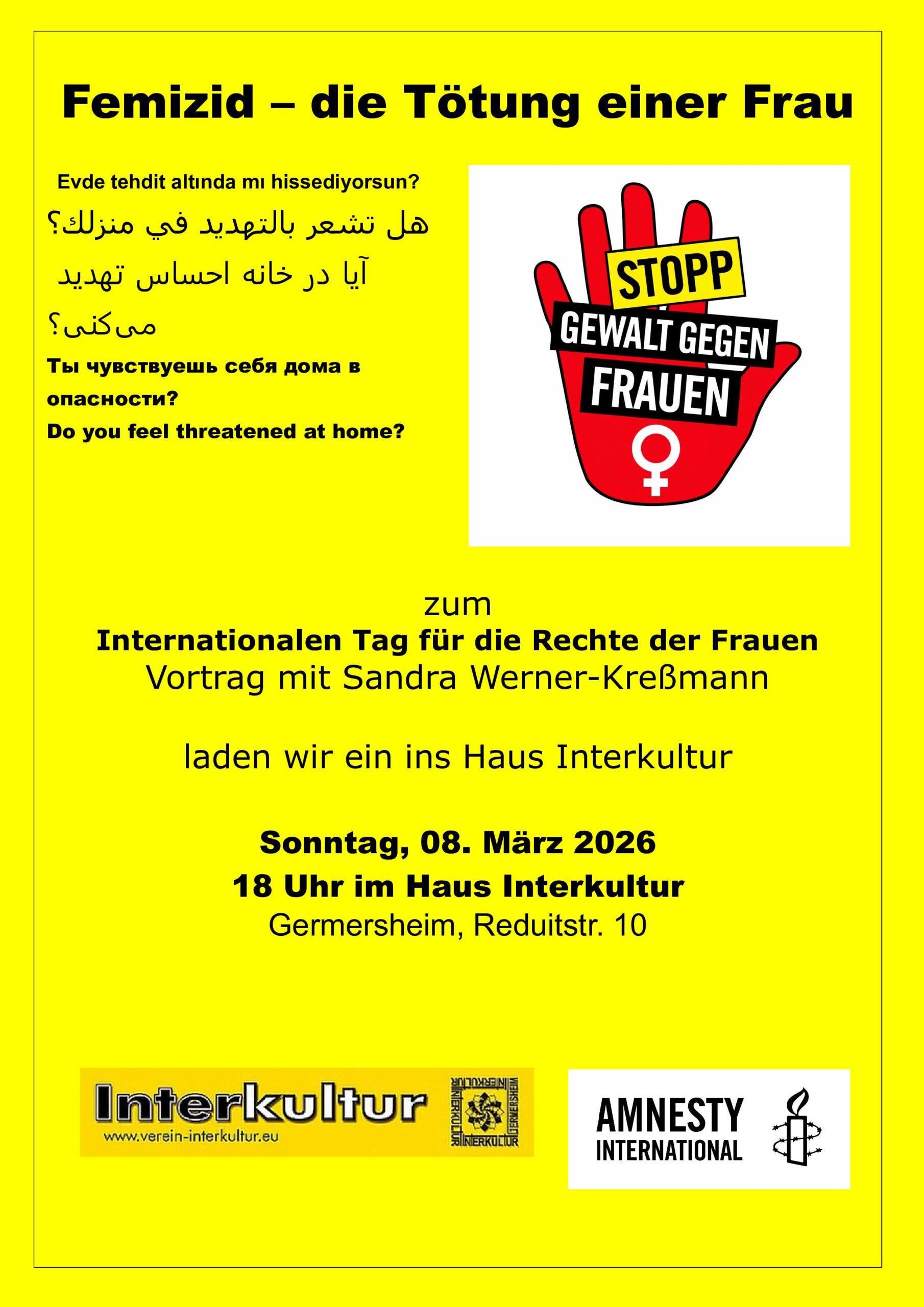 8.3.2026 Internationaler Tag der Frau – Vortrag von Sandra Werner-Kressmann zum Thema Femizid im Haus Interkultur.