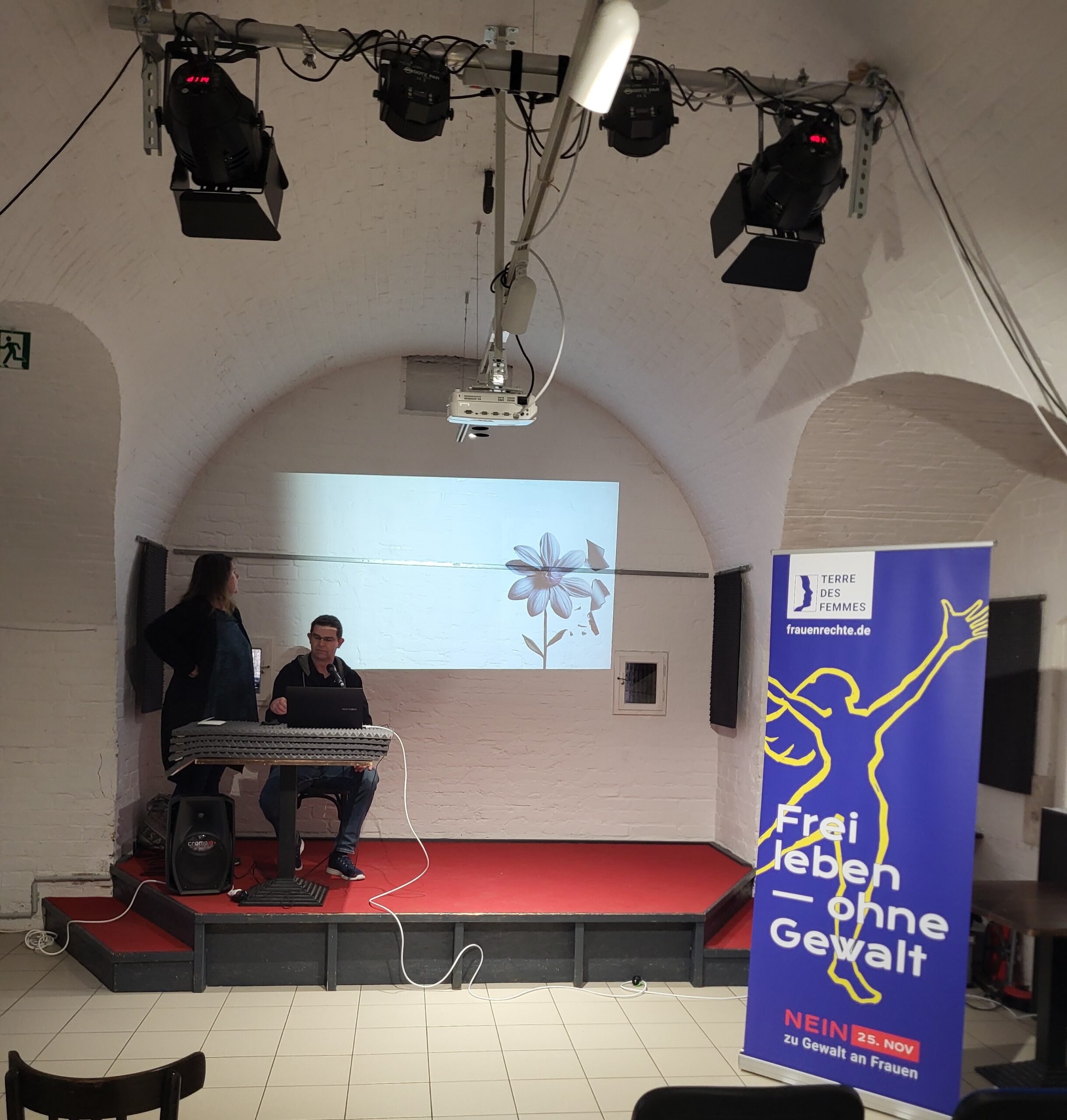 1.10.2022: Zwischen allen Stühlen – Sprechkunst und Musik. Im Rahmen der Interkulturellen Woche präsentierte die Sprechkunstgruppe Ohrenschmaus ernste und nicht ganz so ernstgemeinte Texte zu Menschenrechten und Interkulturalität. Ergänzt wurde das Programm durch Musik von Lynn Elms (indianische Flöte) und dem Musikerduo CELLOUD – Isabel Eichenlaub und Samer Alhalabi (Cello und orientalische Laute Oud).